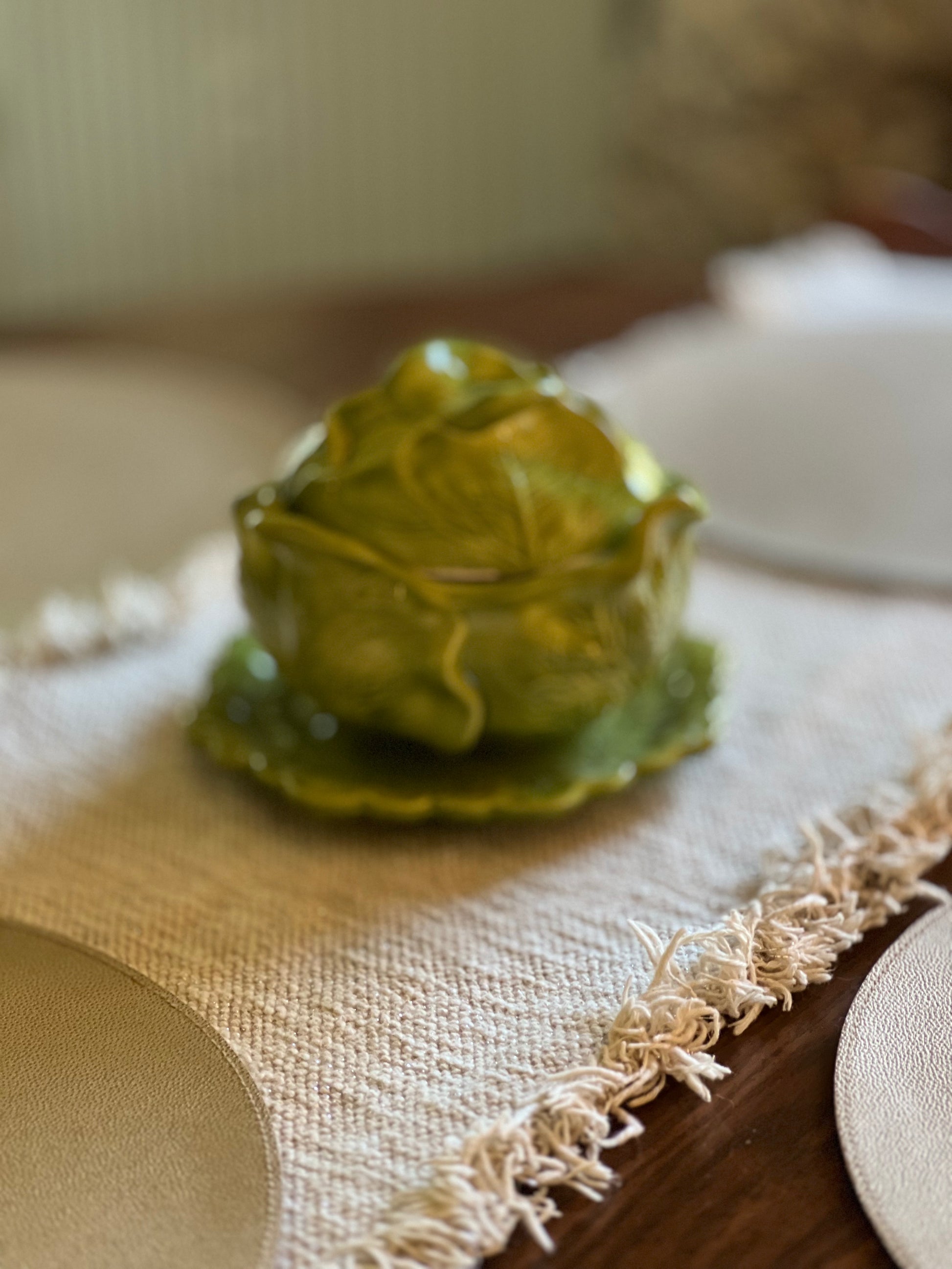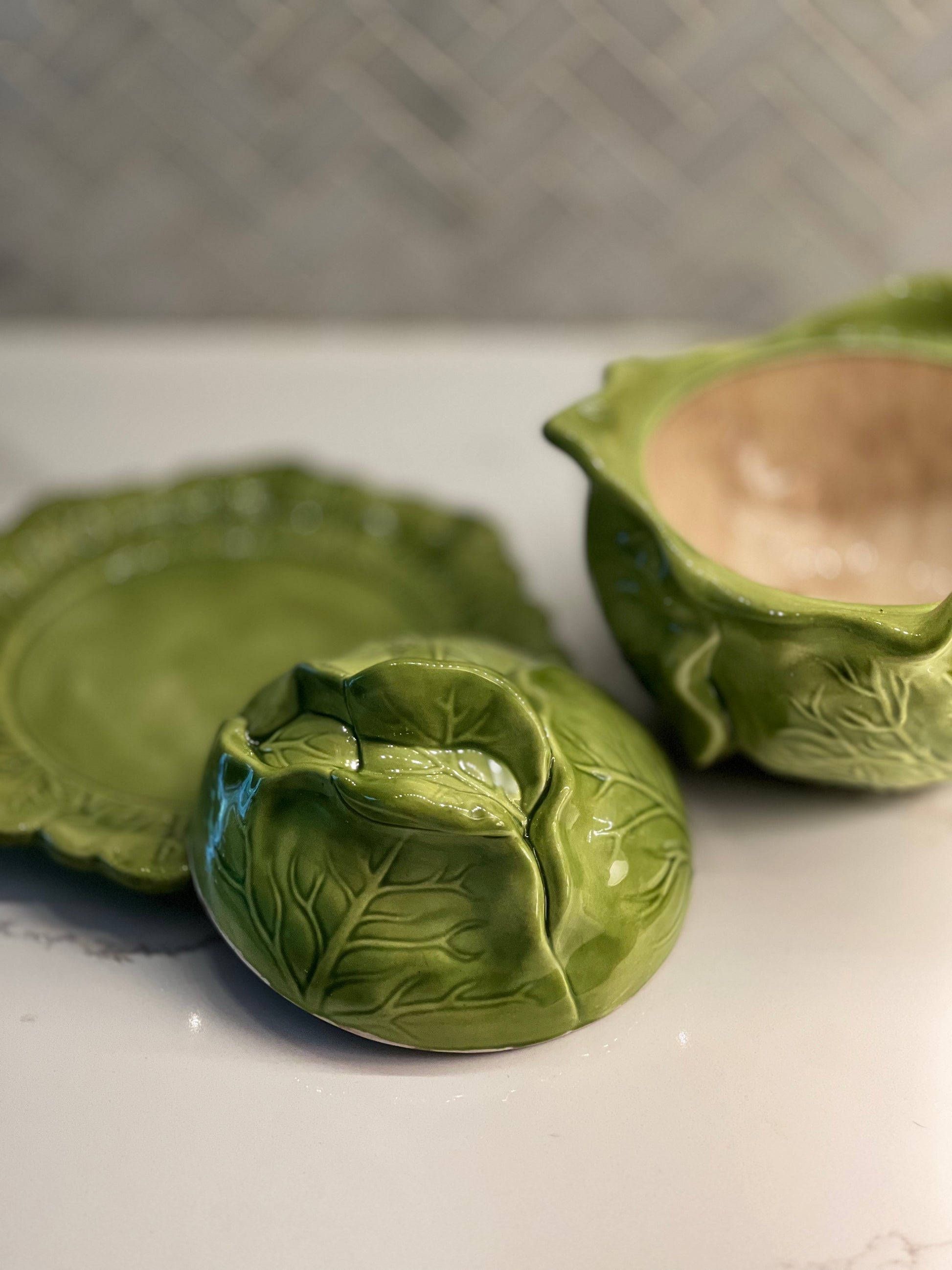 This charming vintage serving set from Holland Mold captures the whimsical aesthetic of 1980s ceramics. The cabbage-leaf design, a signature Holland Mold motif, features hand-painted details and organic sculptural forms that bring character to any table. Perfect for serving vegetables, salads, or as a decorative display piece, this set showcases the craftsmanship typical of Holland Mold collectible pottery. An excellent addition for vintage enthusiasts and those seeking distinctive serveware with authentic period appeal.