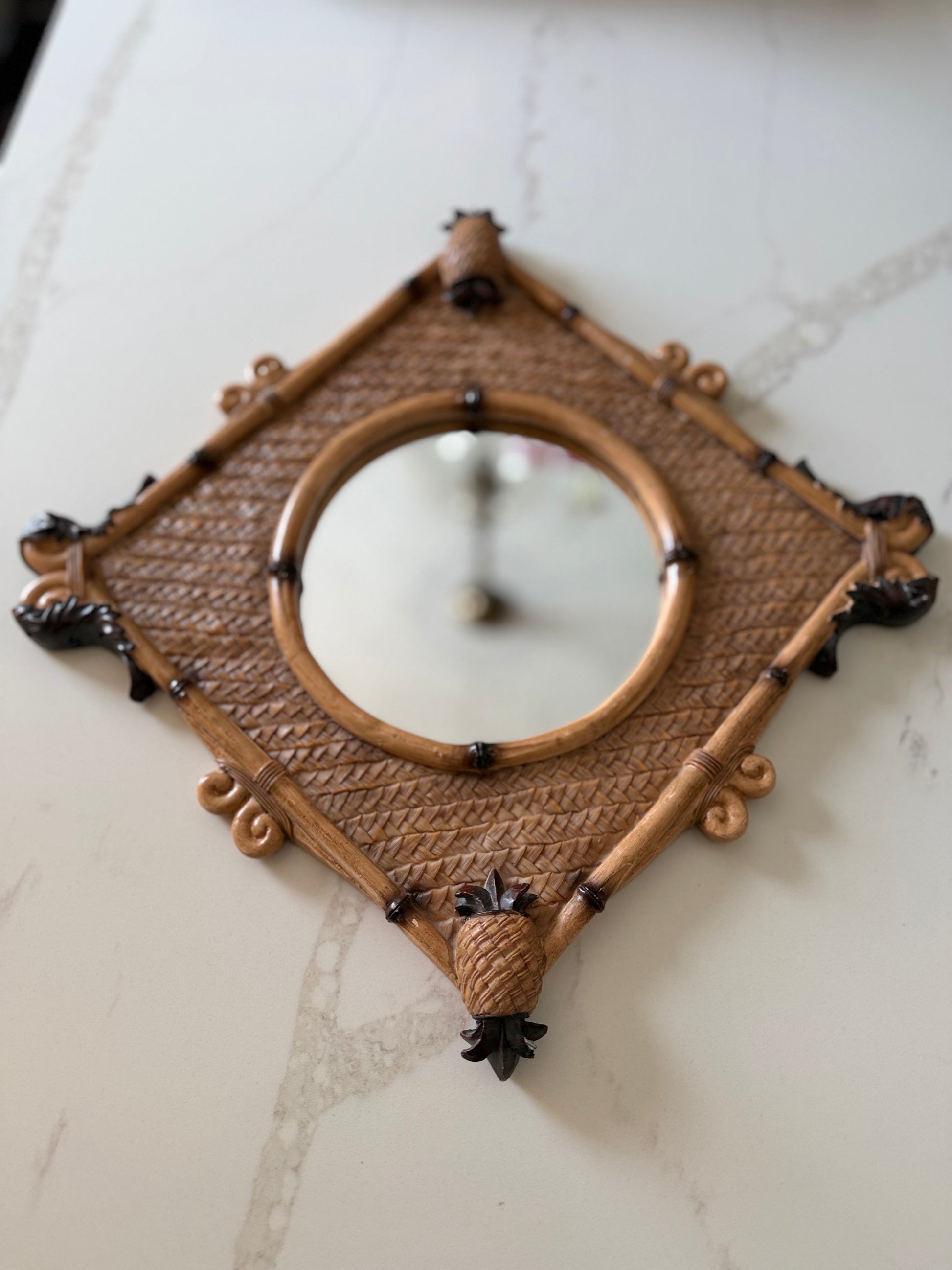 Elevate your interior with this striking Vintage Regency Faux Pineapple Mirror, a sophisticated statement piece that merges classical design with whimsical charm. Crafted in the refined Regency style, this mirror features an ornamental pineapple motif—a symbol of luxury and hospitality dating back centuries. The decorative frame showcases meticulous detailing that captures the essence of period elegance, while the reflective surface brightens any room. Perfect for entryways, living spaces, or powder rooms, this distinctive accent brings timeless character and conversation-starting appeal to your décor.